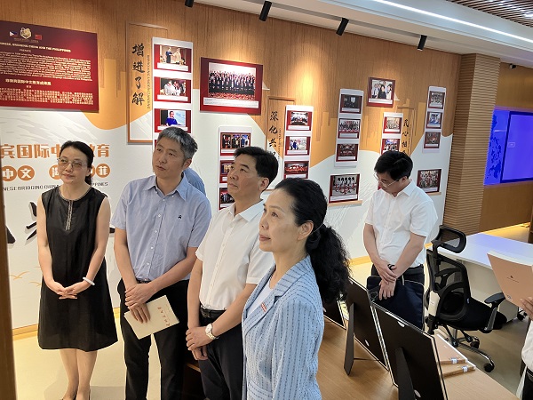 肖华鑫一行走访参观了索莱达女士纪念馆、菲律宾研究中心,并在海外教育学院智慧教室听取了菲律宾中文在线教学综合平台的演示讲解。肖华鑫表示,OD官网历史悠久、底蕴深厚,在海外华文教育等工作方面拥有坚实基础,取得可喜成果,希望学校系统梳理总结成功经验,继续做好国际中文教育推广工作和中华文化的海外传播,持续发挥海外校友会桥梁纽带作用,广泛凝聚海内外力量,画好强国建设、民族复兴的最大同心圆。