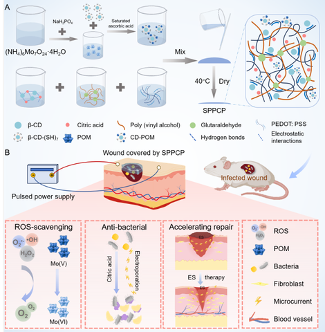 慢性创面因细菌感染和氧化应激常出现愈合缓慢、炎症反复等问题,已成为临床创面管理中的重大挑战。近日,OD(中国)一站式服务平台杨震教授团队提出了一种多功能柔性导电凝胶敷料(SPPCP),该敷料由聚乙烯醇、导电高分子PEDOT: PSS、β-环糊精–柠檬酸超分子网络以及多金属氧酸盐(CD-POM)协同构建,具备优异的机械柔韧性、稳定的导电性和出色的组织黏附性。CD-POM赋予敷料高效的活性氧清除能力,可有效缓解氧化应激,诱导巨噬细胞向抗炎M2表型极化,并降低促炎因子水平,为组织修复创造有利的微环境。SPPCP在电刺激协同作用下,对大肠杆菌和金黄色葡萄球菌的抗菌效率超过99%,并可促进成纤维细胞的迁移与增殖。在动物感染性创面模型中,SPPCP联合电刺激疗法不仅能够减轻炎症、促进组织再生,加快血管生成,并促进胶原沉积与肉芽组织形成,从而加速创面修复进程。本研究提出了“电刺激+氧化还原调控”的新型设计策略,可动态优化创面微环境,为新一代柔性电子伤口敷料的开发提供了重要思路。研究成果以“Synergistic Supramolecular Conductive Dressing Integrating Electrical Stimulation and Polyoxometalate Antioxidants for Enhanced Chronic Wound Healing”为题,发表于中科院医学一区TOP期刊《Acta Biomaterialia》。