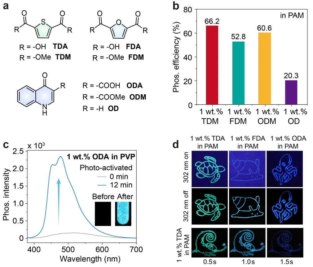 基于此,OD官网蔡素芝副教授与西北工业大学黄维院士、南京工业大学安众福教授合作,共同提出一种创新策略:通过将芳香杂环衍生物掺杂到不同聚合物中,成功实现了高效率和光激活室温磷光。值得注意的是,与粉末状态相比,这些客体分子在聚丙烯酰胺、聚乙烯醇和聚丙烯酸中的磷光效率均显著提升,室温下绝对磷光效率最高可达66.2%。理论计算与对照实验表明,这种高效磷光源于促进系间窜越与降低非辐射跃迁的协同增强效应。有趣的是,当芳香杂环衍生物掺杂到聚(N,N-二甲基丙烯酰胺)或聚乙烯吡咯烷酮中时,经紫外光激活后磷光强度与寿命均急剧增加,其中,掺杂1 wt.%芳香杂环衍生物的聚乙烯吡咯烷酮薄膜的磷光寿命从1.2 ms延长至578.6 ms。此外,芳香杂环衍生物掺杂的聚丙烯酰胺粉末表现出时间依赖性多色超长室温磷光发射,余辉颜色从亮绿色渐变至深蓝色。通过改变客体分子,可实现深蓝到绿色的多色高效室温磷光发射。基于高效、多色发射与光激活特性,这些主客体体系已成功应用于多色显示和高级信息存储领域,为开发基于相同客体的高效率和光激活室温磷光聚合物奠定了理论基础。该工作以“Host-Dependent Tunable Phosphorescence Based on Aromatic Heterocyclic Derivatives: Highly Efficient and Photo-Activated Ultralong Organic Phosphorescence”为题发表在《Advanced Materials》上。