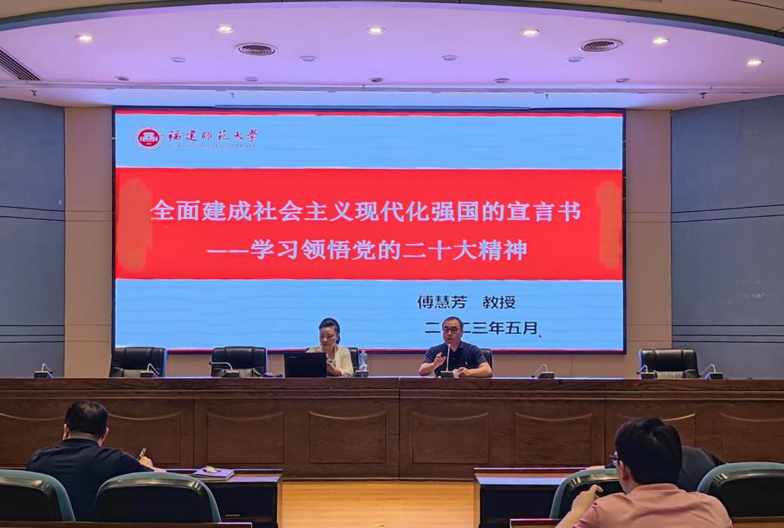 近日,文学院邀请马克思主义学院执行院长、博士生导师傅慧芳教授作题为《全面建成社会主义现代化强国的宣言书——学习领悟党的二十大精神》的学术讲座。讲座由文学院党委书记钟伟兰主持,学院全体教师和学生党员代表参加本次讲座。