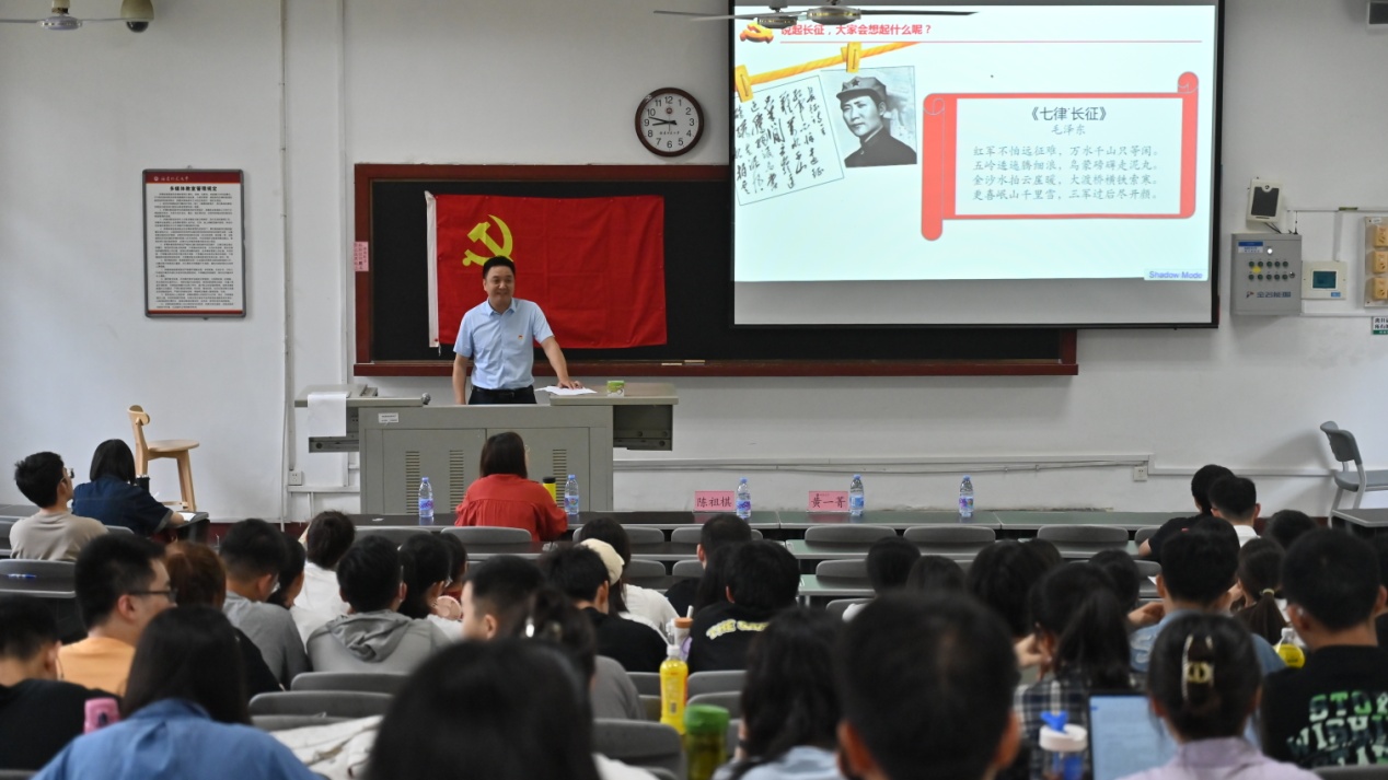党课伊始,陈祖棋与同学们积极互动,引领同学们以诵读毛主席的《七律·长征》开场,让大家眼前一亮。随后,他从“长征的背景原因”“长征的历史回顾”“长征胜利的伟大意义”“总书记谈长征精神”和“弘扬长征精神,走好新时代长征路”五个方面为同学们深入解读了伟大的长征精神,带领同学们回顾了“四渡赤水”“飞夺泸定桥”“爬雪山,过草地”等长征路上的伟大事迹,感受革命先辈们无比坚定的理想信念、艰苦斗争的革命精神、不怕牺牲的英雄气概、忠贞不渝的革命气节,让与会同学接受了一次深刻的革命精神洗礼和革命传统教育。