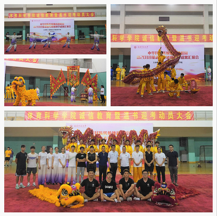 6月25日晚,体育科学学院在室内篮球馆举办中华传统体育进校园暨2018级武术专修班教学成果汇报会。院党委副书记钟晓波、副院长许文鑫,武术教研室老师刘祖辉、各年级辅导员,及学院全体本科生和部分研究生参加了活动。