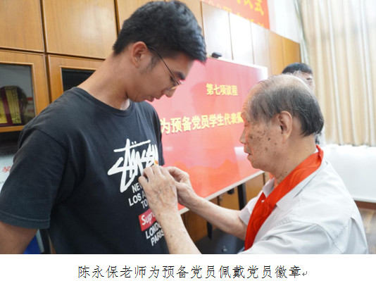 谢学潜和陈永保为新入党的学生党员代表佩戴党徽。学生党员表示,要学习老党员们一心向党、艰苦奋斗的崇高品质,为实现中华民族伟大复兴的中国梦贡献力量。