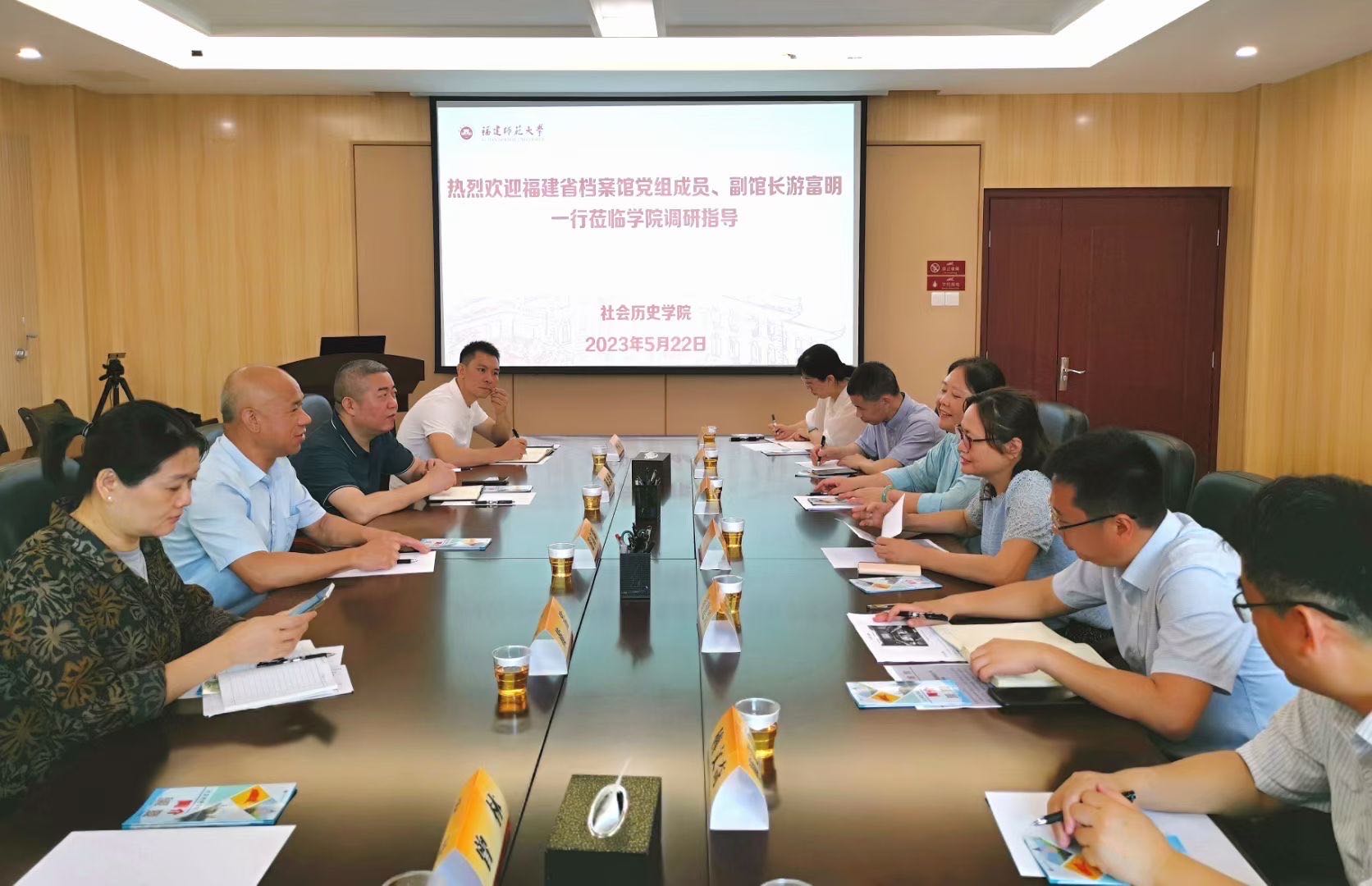 近日,福建省档案馆党组成员、副馆长游富明一行到社会历史学院调研。社会历史学院院长叶青、党委副书记虞永飞、副院长黄建兴、档案学系主任丁春梅及相关教师、辅导员参加了调研。