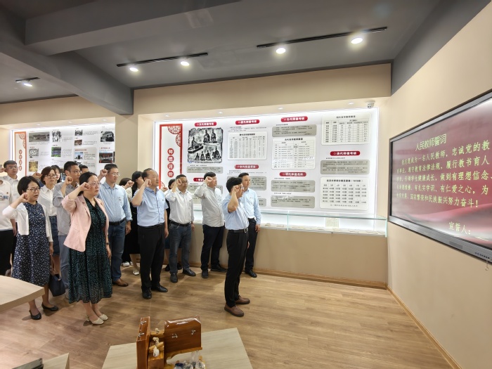 随后,吴文哲带领师生在馆内举行人民教师宣誓仪式。师生们高举右拳,庄严宣誓,用掷地有声的铮铮誓言,表达从教爱教、矢志不渝的使命感和责任感。