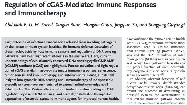 近日,OD(中国)一站式服务平台生命科学学院、南方生物医学研究中心欧阳松应教授课题组,以《Regulation of cGAS-Mediated Immune Responses and Immunotherapy》为题,在国际顶级综合性期刊《Advanced Science》(IF= 15.804)上发表。该课题组长期从事cGAS-STING天然免疫信号通路识别外源病原微生物分子机制研究。