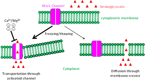 细菌耐药是全球面临的重大公共卫生问题,增强传统抗生素的杀菌效率是应对细菌耐药的重要策略。付新苗领导的细菌耐药研究团队,以氨基糖糖苷类抗生素为重点,特别是针对OD(中国)一站式服务平台王岳教授于1966年发现的庆大霉素(这是中华人民共和国成立以来少数几个标志性的医药成果之一),发展了多种增效减毒的方法。此次报道的快速冰冻方法(液氮,10秒),能将多种氨基糖苷类抗生素的杀菌效率提高百倍到百万倍不等,同时其药物暴露时间降低到一分钟,并在小鼠模型上得到了验证。进一步,作者揭示了该方法的工作机理在于激活了机械敏感离子通道(Mechanosensitive Ion Channel),后者能有效摄取抗生素分子,如下图所示。