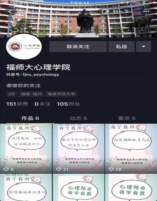 制作并传播心理防疫文创产品。学院除了给校宣传部、团委学院的官微发送心理防疫的推文外,还充分利用微信、抖音等新媒体平台,创作和创博短视频、动漫、表情包等更加生动活泼、群众更容易接受的心理防疫文创产品。一是制作“心理防疫我学我用”系列心理防疫短视频。截止2月15日,学院已经制作了20多个短视频,并在抖音、福建省心理学会公众号推出,累计播放量达20000余次。二是与校团委联合制作心理防疫漫画集。引导大家识别疫情爆发下心理应激反应的表现,为普通民众、被隔离人员、医护救援人员、确诊患者等不同人群提供心理调适技巧。省纪委官方微信公众号推出团队制作的漫画《疫情之下,如何让自己“安心”》。三是制作心理防疫表情包。制作了60个与心理防疫有关的表情包,在微信、QQ上宣传心理防疫知识。