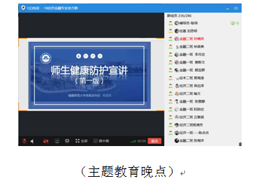 39日,经济学院辅导员、各年级学生共计2000余人通过各大网络平台收看“全国大学生同上一堂疫情防控思政大课”,引发师生热烈反响,2019级金融学类本科生林晓辉所作的《山河今有恙,吾辈当自强》观后感获学工部微信采纳。315日,本硕博各年级围绕疫情防控和爱国主义主题教育中涌现出的英雄人物和故事、学风建设开展主题教育晚点活动,以辅导员讲述、文稿演示、图文介绍、师生互动等形式,将疫情防控知识、爱国主义教育和学风建设融进线上课堂,提高学生的自我防护能力,响应“停课不停学”号召,增强学子的爱国情怀和责任担当。