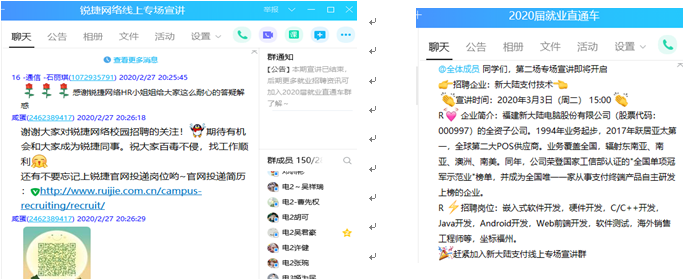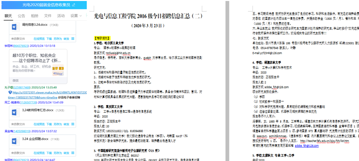 目前已对接20余家用人单位,通过2020届毕业生就业直通车QQ工作群,先行组织4家用人单位举办空中专场招聘宣讲会,受众达900多人。近期还将通过智联招聘等平台,于4月初联合校内外相关院校、专业,举办光电、信息类线上专场招聘会,为毕业生提供更丰富的就业岗位。学院还邀请锐捷网络集团等知名企业HR部门负责人举办4网络视频答疑会,实现用人单位与毕业生之间的有效对接,让毕业生更好地了解行业企业,更有针对性地进行应聘准备,树立更正确的就业观念和更强的就业信心。