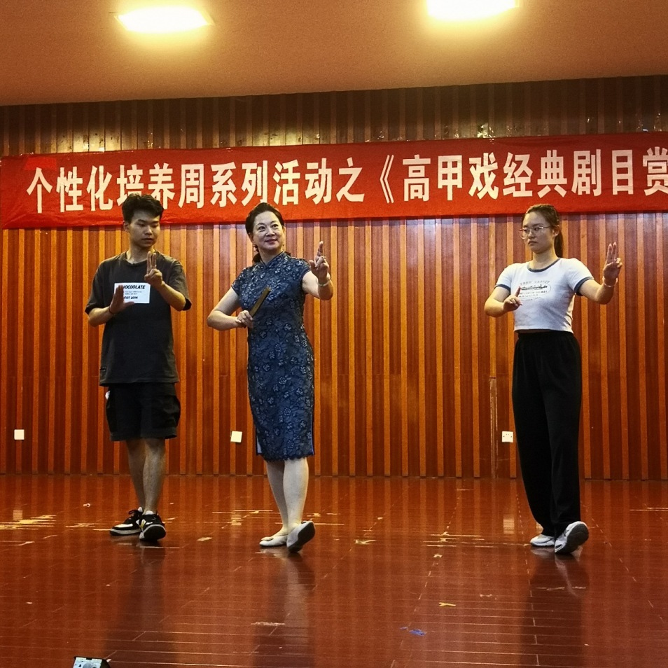 讲座中,吴晶晶介绍了高甲戏的历史渊源、主要流传地区,以及厦门市金莲陞高甲剧团的历史传承和发展情况,讲解了四种丑行的不同表演形式、高甲戏的旦角科步,并分析了每种科步的表演特色。在展示环节,吴团长的徒弟们上台示范了基本科步动作,以及不同角色行当的表演片段,乐队展示了特色乐器压脚鼓及其对音乐情绪的推动作用。在互动环节,吴团长亲自示范,耐心带领同学们学习表演动作。