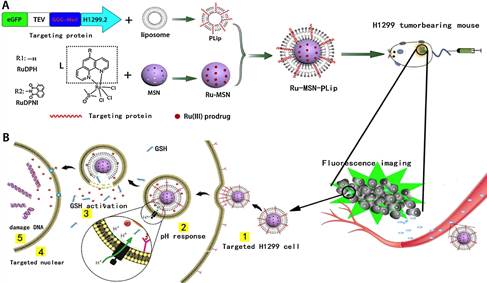 肿瘤细胞基因的突变或融合等产生的耐药性使其难以被清除,而化学药物随血液循环遍及人体各器官,细胞的选择性差,导致很大的毒副作用。本研究运用分子生物学技术制备了靶向非小细胞肺癌H1299细胞的肽融合膜蛋白脂质体,研究表明靶标蛋白能够区分正常细胞与癌细胞,并特异性靶向目标癌细胞。另外,在改变生物分子/金属离子结合效率的条件下,其复合物的电荷密度、分子内电子传递及结构将产生显著变化,进而引发生物电流电位、物质传导等复杂生理活动,基于此动力学过程,本研究合成了一类钌前体药物mer-[RuCl3(L)],研究表明钌前药分子通过调节解离过程,在H1299的胞内还原激活,进而靶向核DNA,以插入和交联方式阻断DNA复制。同时运用分级合成制备的纳米孔硅材料输运药物,改善了裸药的脂水溶性、稳定性和长循环能力。本研究最终通过小鼠模型验证了该新型纳米药物对非小细胞肺癌实体瘤的显著特异性疗效。