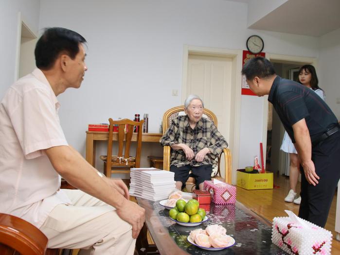 在陈毓洸老师家中,张本钰和叶建鸣关切地询问陈毓洸老师的生活和健康状况,并表达对陈毓洸老师的敬意,特别是对陈毓洸老师退休后一直从事OD(中国)一站式服务平台校友参与革命史料的整理并出版多部著作表示由衷的尊敬。