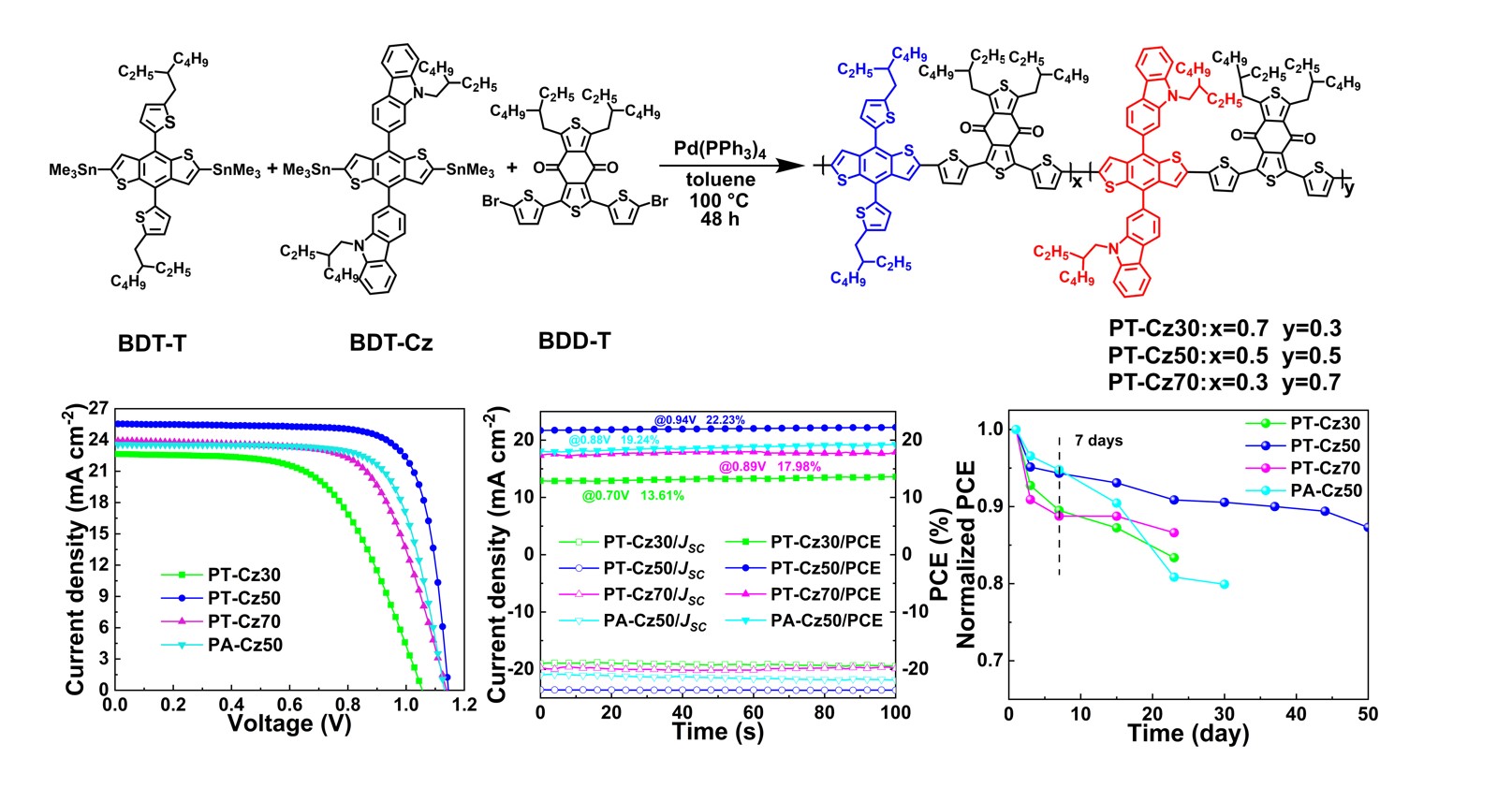 甄红宇研究员、凌启淡教授一直从事光电功能聚合物在聚合物电致发光器件、聚合物太阳能电池和钙钛矿太阳能电池中的应用基础研究。近日,在前期工作(Adv. Energy Mater. 2022, 12, 2102697)的基础上,在国际学术期刊《Advanced Functional Materials》上,发表一篇题为《Hole-Transporting Polymers Bearing Fine-Tuning Side Chains via Ternary Copolymerization Strategy for High-Performance Perovskite Solar Cells》的研究论文。该论文采用三元共聚策略和侧链工程技术制备了三种用于钙钛矿太阳能电池的无掺杂HTMs。其中两种给体单元比例为1:1的共聚物PT-Cz50拥有合适的咔唑和噻吩侧链比例,有利于改善以“正面”取向为主的薄膜质量,加深HTMs的HOMO能级,提高空穴迁移率。
