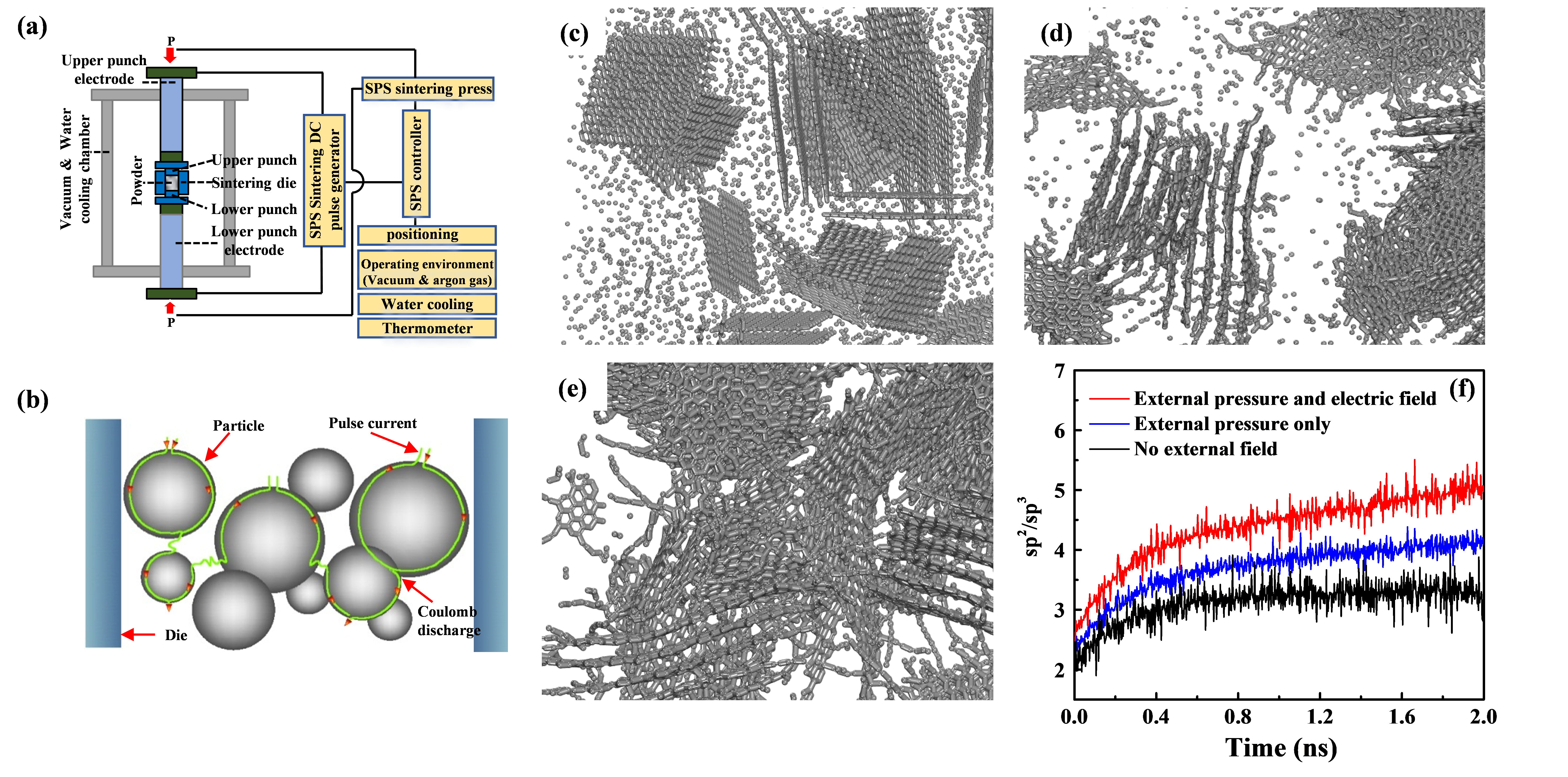 SPS设备及加热机制图及其快速炭化的分子动力学模拟图