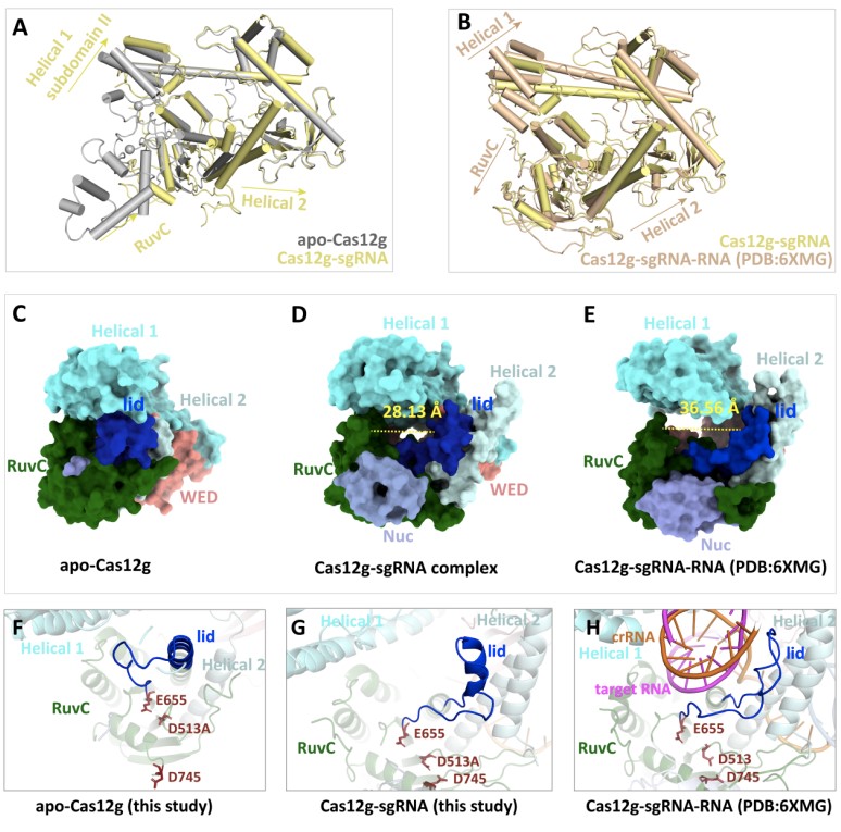 CRISPR-Cas (clustered regularly interspaced short palindromic repeats) 系统是细菌体内的获得性免疫系统,用于抵抗外源核酸物质的侵染。第二大类CRISPR-Cas系统仅需单个Cas效应蛋白即可完成对外源DNA或RNA的降解,因此可以广泛用于核酸编辑工作。2019年,研究者鉴定并报道了多种新型的第二大类V型Cas12家族的效应蛋白,Cas12g是其中仅有的具备核糖核酸酶 (RNase) 活性的效应蛋白 (Yan et al., Science, 2019)。在以往研究中,Cas12家族的效应蛋白均通过保守的RuvC核酸酶结构域靶向切割DNA,而Cas12g的发现打开了一个新的可能性,即使用Cas12g作为一种高效的RNA编辑工具。因此,揭示Cas12g蛋白如何被靶核酸激活并发挥其RNase活性的分子机制可为今后应用与改造CRISPR-Cas12g系统提供理论依据。尽管此前畅磊福研究团队已报道Cas12g与靶核酸形成复合物的结构与功能研究 (Li et al., Nature Chemical Biology, 2021),但Cas12g蛋白是如何被激活并切割靶核酸底物仍存在一些尚未研究清楚的问题。 近日,OD官网欧阳松应教授团队在PLoS Genetics上在线发表了题为 Structural transitions upon guide RNA binding and their importance in Cas12g-mediated RNA cleavage 的研究论文,深入分析了Cas12g蛋白结合sgRNA前后的构象变化及切割RNA底物的分子机制,为应用Cas12g开展RNA编辑工作提供了新的理论指导。