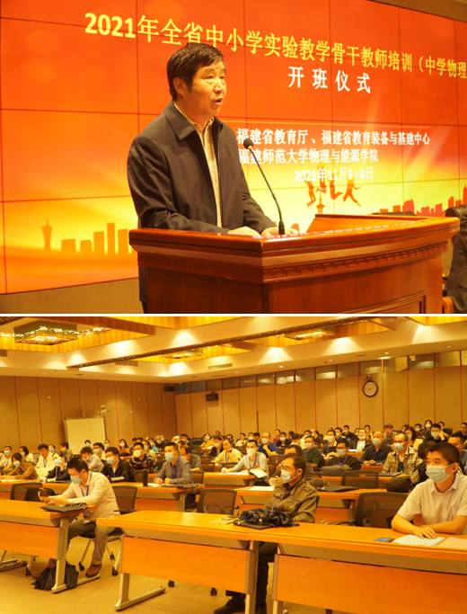 11月4日,全省中小学实验教学骨干教师培训(中学物理)开班仪式在旗山校区宏达厅举行。福建省教育厅副厅长李迅、福建省教育厅督导处处长黄建顺、福建省教育装备与基建中心副主任方嘉、副校长郑家建、物理与能源学院党委书记林玉辉、副院长陈水源和全体培训教师参加了开班式。