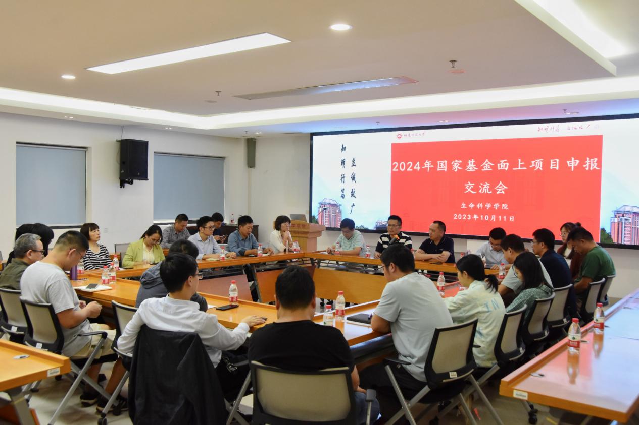 10月11日, 生命科学学院召开2024年国家自然科学基金面上项目申报交流会。学院党委书记张兆文、副院长付新苗,以及拟申报2024年度国家项目的老师参加会议。