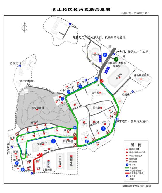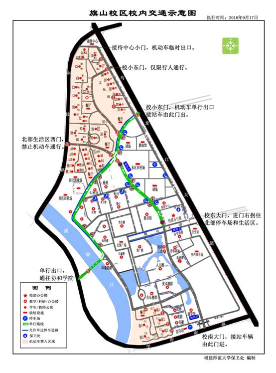 (三)小东门(明德路)、星槎桥门、仓山大道北段、明德路、溪源路北段实行单向通行,北部生活区西门禁止机动车通行,请严格按交通示意图行驶,严禁逆向行驶。