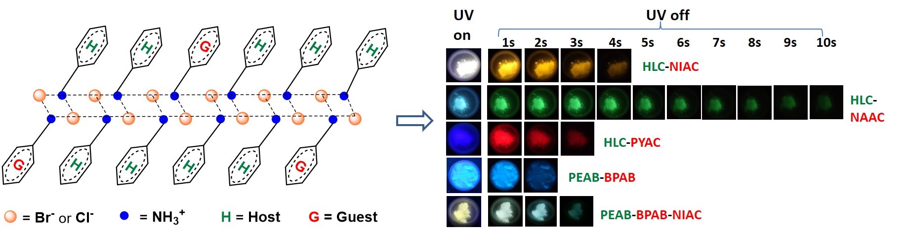 无金属二维层状有机卤化物骨架示意图和紫外灯下掺杂卤化物的余辉