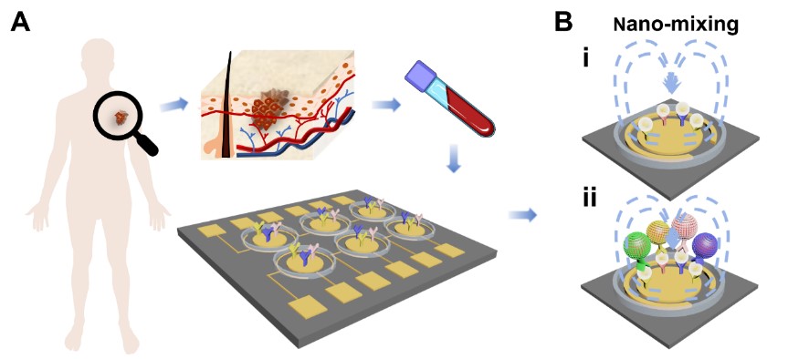 外泌体在细胞间通讯、肿瘤微环境调节、免疫抑制等生理和病理过程中具有重大作用。然而外泌体的常规分离分析方法灵敏度低,需要样品量大,极大限制了外泌体作为体液疾病标志物在临床的应用。近期,OD官网光电与信息工程学院王静研究员提出微流控芯片结合表面增强拉曼光谱技术的外泌体检测方法。该方法的检测灵敏度为1个/µL,且仅需10 µL血清、血浆样品。利用该方法,从实验上证实了不同肿瘤来源外泌体的蛋白表型存在高度异质性。该成果发表在ACS Sensors(SCI一区,IF=7.71),王静研究员为第一作者。该方法还可以灵敏地检测早期黑素瘤患者血清中肿瘤相关外泌体,有望用于黑素瘤的早期筛查诊断。该工作发表于Advanced Functional Materials(SCI一区,IF=18.81),王静研究员为第一作者。