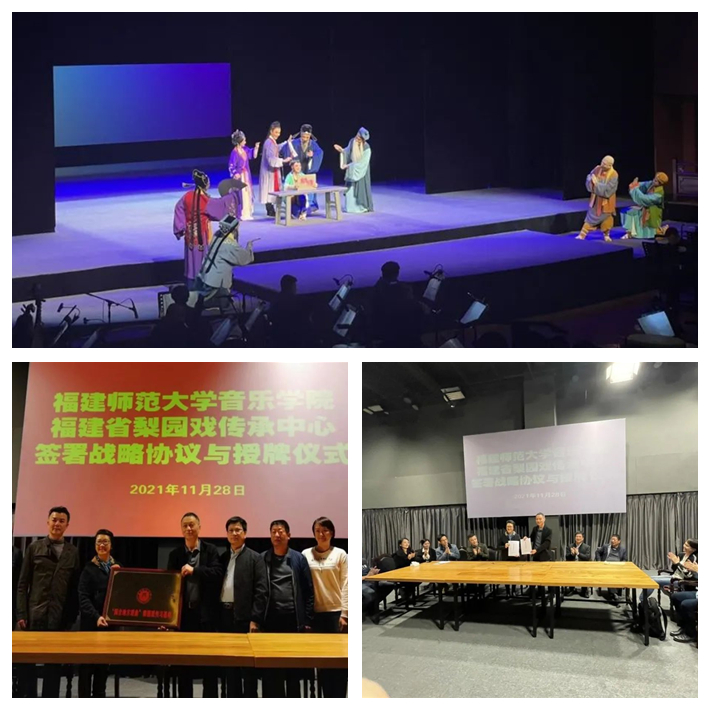 近日,音乐学院与福建省梨园戏传承中心签署战略合作协议。音乐学院党委书记陈林男与福建省梨园戏传承中心团长曾静萍代表双方签署战略协议,并授予福建省梨园戏传承中心“教育部中华优秀传统文化传承基地——‘闽台地方戏曲’梨园戏传承基地”与“OD官网音乐学院‘梨园戏音乐实践基地’”。