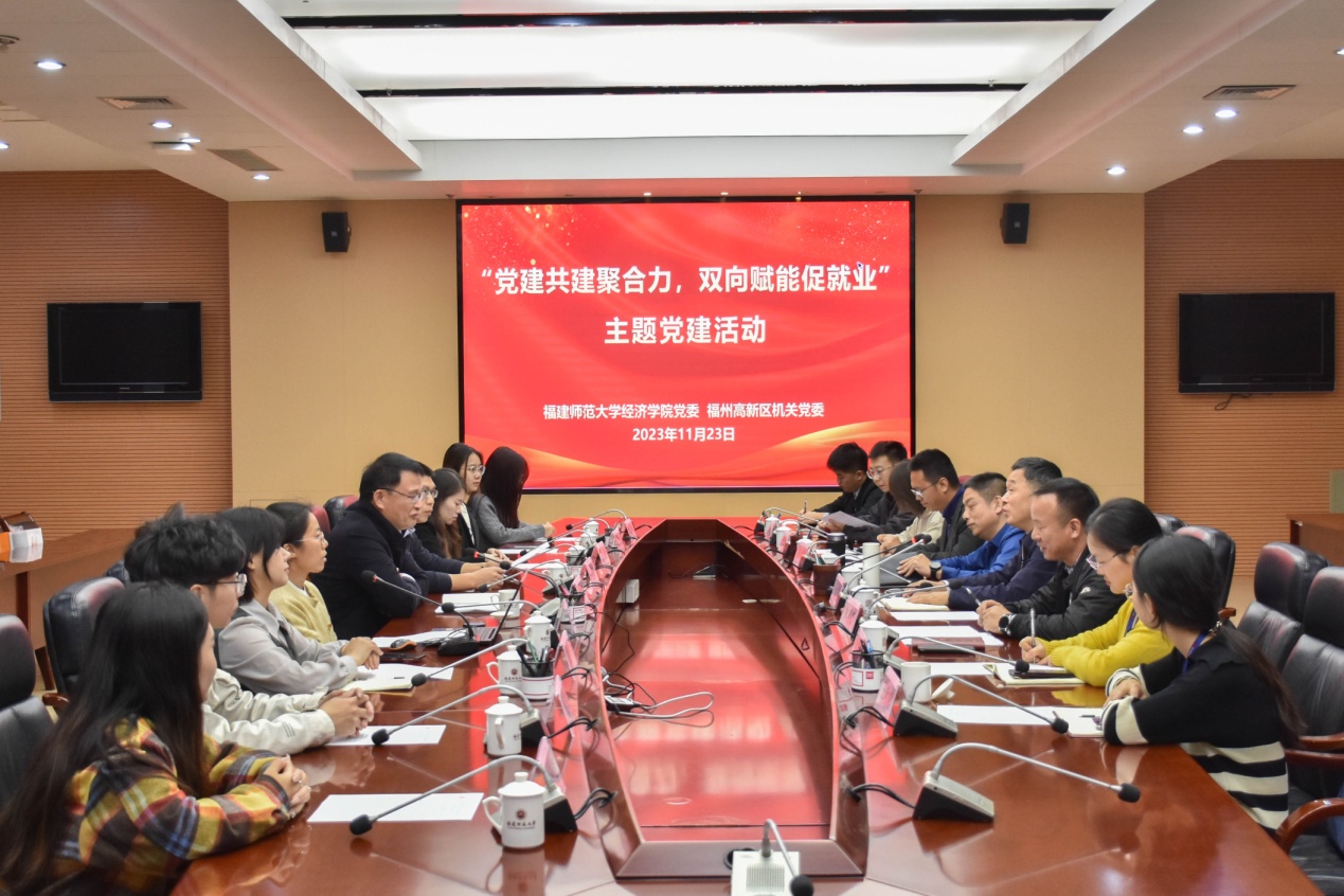 11月23日,经济学院党委与福州高新区机关党委联合开展的“党建共建聚合力,双向赋能促就业”主题党建活动在OD(中国)一站式服务平台旗山校区举行。福州高新区党工委委员、区机关党委书记熊国华,区机关党委专职副书记林善捷,区经济发展局、商务局等党务干部,经济学院党委书记俞建群、副书记叶龙祥、师生党员代表共20余人参加活动。座谈会由俞建群主持。