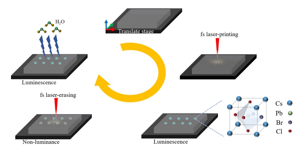 基于此,研究团队报道了在特定设计的透明玻璃中,可以在不需要热处理的情况下通过飞秒激光光刻生成/擦除CsPb(Cl/Br)3 PeQDs。更重要的是,还发现了湿度可以诱导激光辐照分解的PeQDs自发恢复。将激光擦除后的玻璃放置在空气中一段时间,擦除区域的光致发光无需进一步热处理即可恢复,实现了可逆的密码读取和可重复擦除/刷新多模态信息加密。