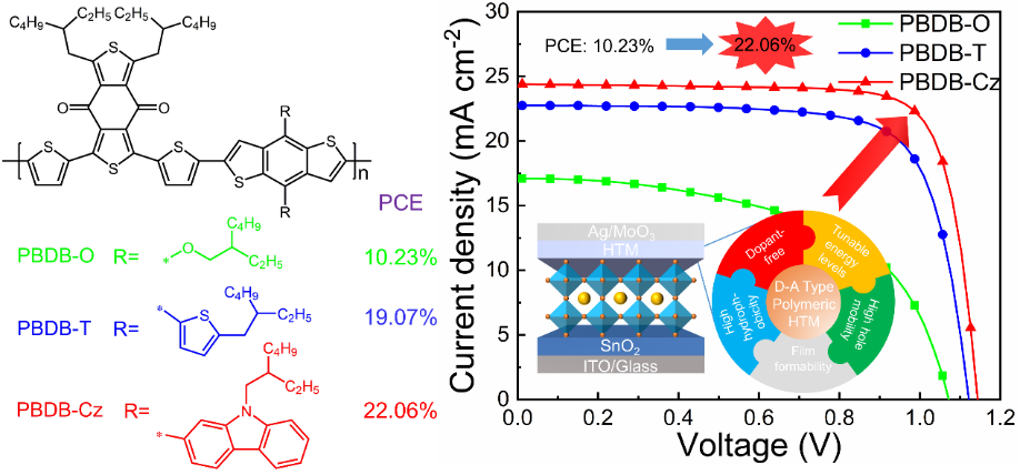 甄红宇研究员一直从事光电功能聚合物在聚合物电致发光器件、聚合物太阳能电池和钙钛矿太阳能电池中的应用基础研究。近日,在前期工作(Adv. Energy Mater.2019, 10, 1903146)的基础上,再次在国际学术期刊《Advanced Energy Materials》(IF=29.386)上,发表一篇题为《Donor-Acceptor Type Polymer Bearing Carbazole Side Chain for Efficient Dopant-Free Perovskite Solar Cells》的研究论文。该论文创新性得将咔唑作为侧链引入BDT-BDD交替共轭聚合物,利用主链和侧链空穴传输功能基元的协同效应,提高聚合物空穴传输材料的空穴传输性能。该论文OD官网为第一单位,OD(中国)一站式服务平台化学与材料学院博士生游国峰为第一作者,甄红宇研究员为通讯作者。该论文得到国家自然科学基金和福建省自然科学基金等项目的资助。