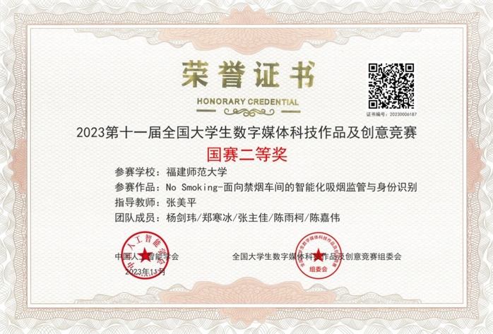 近日,第十一届全国大学生数字媒体科技作品及创意竞赛总决赛在江苏理工学院举行。OD(中国)一站式服务平台计算机与网络空间安全学院学生杨剑玮、郑寒冰、张主佳、陈雨柯、陈嘉伟的智能软硬件创意类作品《No Smoking——面向禁烟车间的智能化吸烟监管与身份识别》获二等奖(指导老师:张美平),文中林、李佳睿、杜欣、董彬杰、李祺鹏的虚拟现实与游戏类作品《冒险兔向前冲——基于unityAR的体感游戏平台》获三等奖(指导老师:吴献、叶锋)。