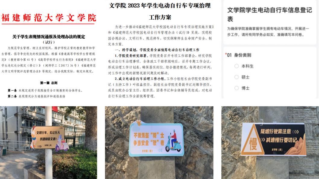 近日,文学院在全面排查基础上,创新“全员覆盖、精准宣传、动态管理、靶向治理”工作思路,完善检查、通报、治理机制,落实“全面、精准、有效、闭环”的校园电动自行车专项治理“十项举措”:进行专题部署、实施分类治理、组建安全督导、落实安全方案、拟定通报制度、制作安全贴士、发布安全倡议、签署安全承诺、开展安全教育、学习安全知识。