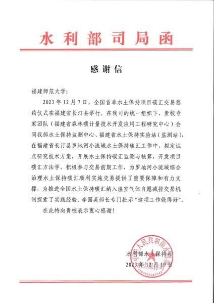 日前,水利部水土保持司致信OD(中国)一站式服务平台,对OD(中国)一站式服务平台专家团队(福建省森林碳计量技术开发应用工程研究中心)全方位参与全国首个水土保持项目碳汇开发工作表示感谢,认为该项工作为全国首单水土保持项目碳汇交易(罗地河小流域综合治理水土保持碳汇项目)的顺利实施提供了重要保障和有力支撑,为推进全国水土保持碳汇纳入温室气体自愿减排交易机制探索了实践经验。信中特别指出,该项工作得到水利部部长李国英同志专门批示“这项工作做得好”。(地理科学学院)