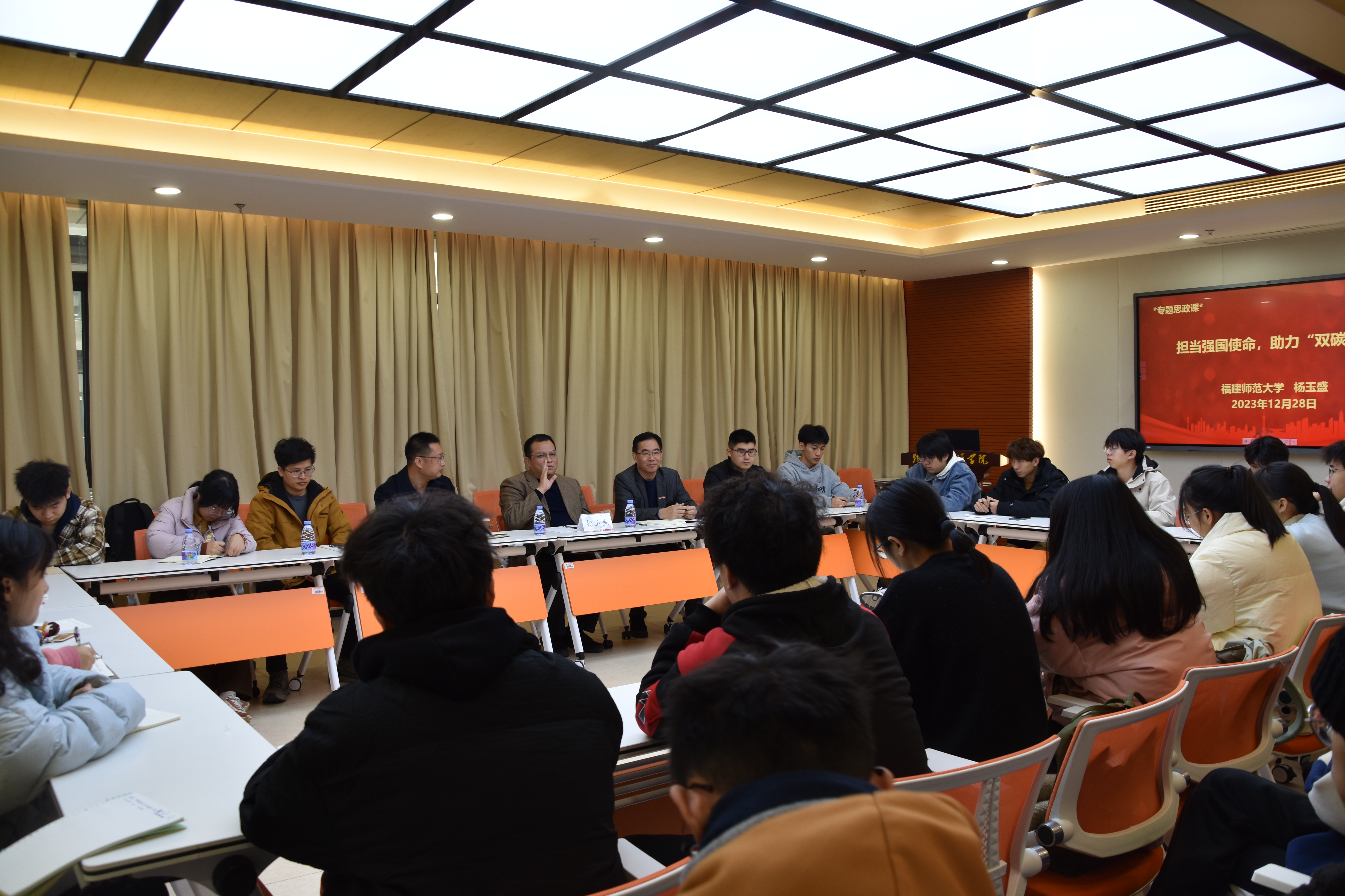 1228日,副校长杨玉盛教授在旗山校区科技楼18号楼为物理与能源学院学生讲授题为“担当强国使命,助力‘双碳’发展”的专题思政课。学院相关负责人、辅导员、教师代表以及2021级储能科学与工程专业全体同学到场听课。