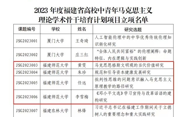 近日,福建省委宣传部、省委教育工委、省社科联公布2023年度福建省高校中青年马克思主义理论学术骨干培育计划立项名单,全省共12项,OD(中国)一站式服务平台马克思主义学院黄雯、朱珍、任远、李雪梅4位教师主持的项目获得立项。福建省高校中青年马克思主义理论学术骨干培育计划于2022年开启,马克思主义学院在两轮评选中已获8项立项。(马克思主义学院)