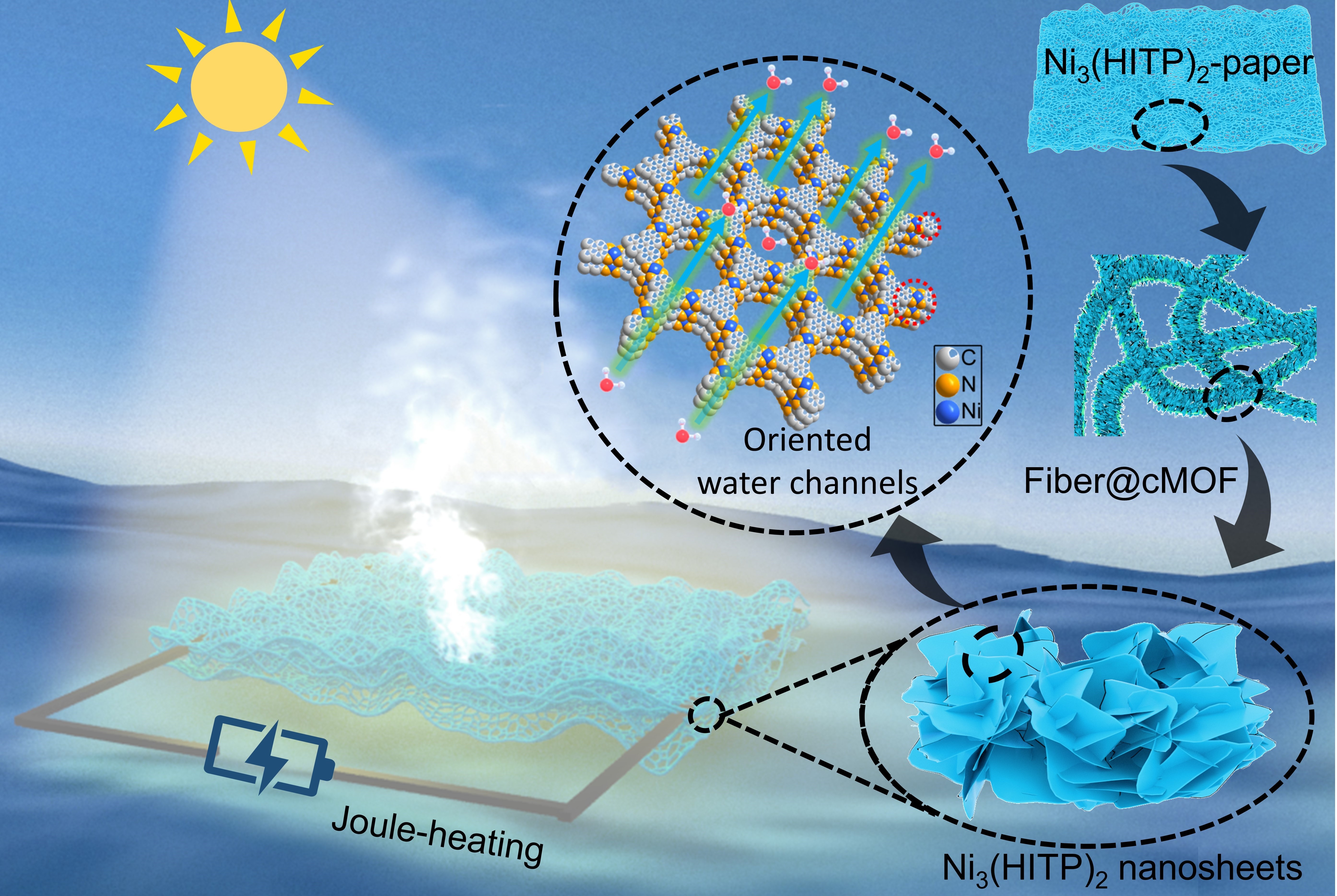 近日,OD(中国)一站式服务平台物理与能源学院陈鲁倬教授与中科院福建物构所王观娥研究员合作,报道了一种具有分级宏观/微孔结构的导电金属-有机框架(MOF)的纳米片薄膜(Ni3(HITP)2-paper),并将其应用于高性能的界面海水蒸发。得益于其独特的亲水位点和疏水骨架通道结构,实现了低水蒸发焓(1676 J g-1)、高光热转换效率(96.25%)和优异的长期耐盐性。利用Ni3(HITP)2-paper协同太阳能光热和焦耳热效应,水蒸发速率被提升到2.60 kg m-2 h-1,超过了其他MOF基材料。这种具有分级宏观/微孔通道的纳米片薄膜的设计策略为电子、生物器件和能源应用提供了启发。该工作以“Conductive Metal–Organic Framework Nanosheets Constructed Hierarchical Water Transport Biological Channel for High-Performance Interfacial Seawater Evaporation”为题发表于Advanced Materials。