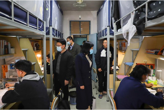 走访过程中,学院领导分组走进李苑、桂苑学生宿舍,现场听课,了解线上教学情况,并就近期学习成效、时间规划、宿舍生活、饮食情况、卫生安全、求职就业等方面与同学们进行深入交谈,详细了解同学们存在的困难与问题,耐心回应学生关切。