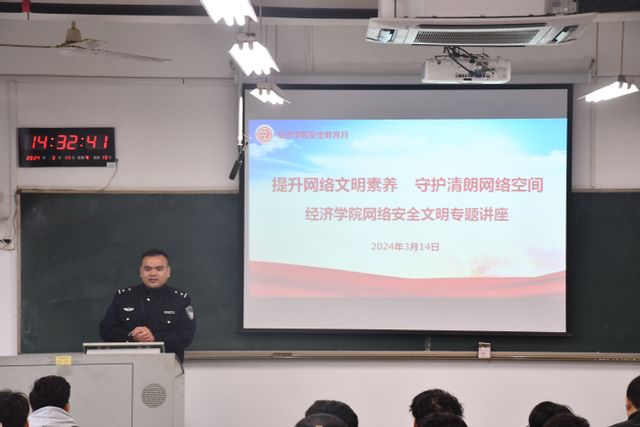 314日,经济学院邀请福州市公安局上街(高新区)分局施豪杰警官作《提升网络文明素养,守护清朗网络空间》专题讲座。学院全体政工干部、全体两委学生干部听取讲座。活动由院党委副书记叶龙祥主持。