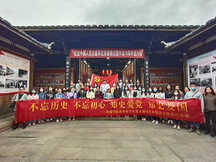 116-7日,传播学院党务行政教工党支部、本科学生党支部先后走进新四军驻福州办事处旧址,开展“不忘历史 不忘初心 知史爱党 知史爱国”暨11月份联合主题党日活动,7个党支部共计47名师生党员先后参观了“致敬最可爱的人——纪念中国人民志愿军抗美援朝出国作战70周年展览”。