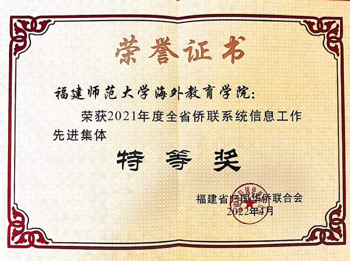日前,海外教育学院荣获福建省归国华侨联合会颁发的“2021年度全省侨联系统信息工作先进集体特等奖”。近年来,海外教育学院高度重视侨情信息工作,以国家民委“一带一路”区域与国别研究中心——OD官网菲律宾研究中心为平台,充分发挥智库中心功能,广泛凝聚侨智侨力,打造校地侨联合作的活动品牌,持续推动讲好福建故事、讲好中国故事。学院组建专业团队,不断深化在服务国家发展战略的智库建设与咨政方面的研究,成效显著,共有33篇咨询报告获得政府部门采纳或领导批示。(海外教育学院)