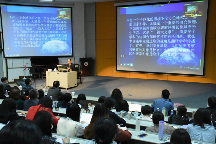 1112日,上海交通大学人文学院院长、教育部“长江学者”、人文社会科学资深教授、欧洲科学院外籍院士王宁教授莅临外国语学院,为师生作题为“国家形象的构建与海外传播”的学术讲座。讲座由院长葛桂录主持。讲座除设外国语学院多功能厅主会场外,还另设两个分会场,线上直播同步听讲。讲座吸引了近500名师生听讲,许多其他学院师生也慕名参加。