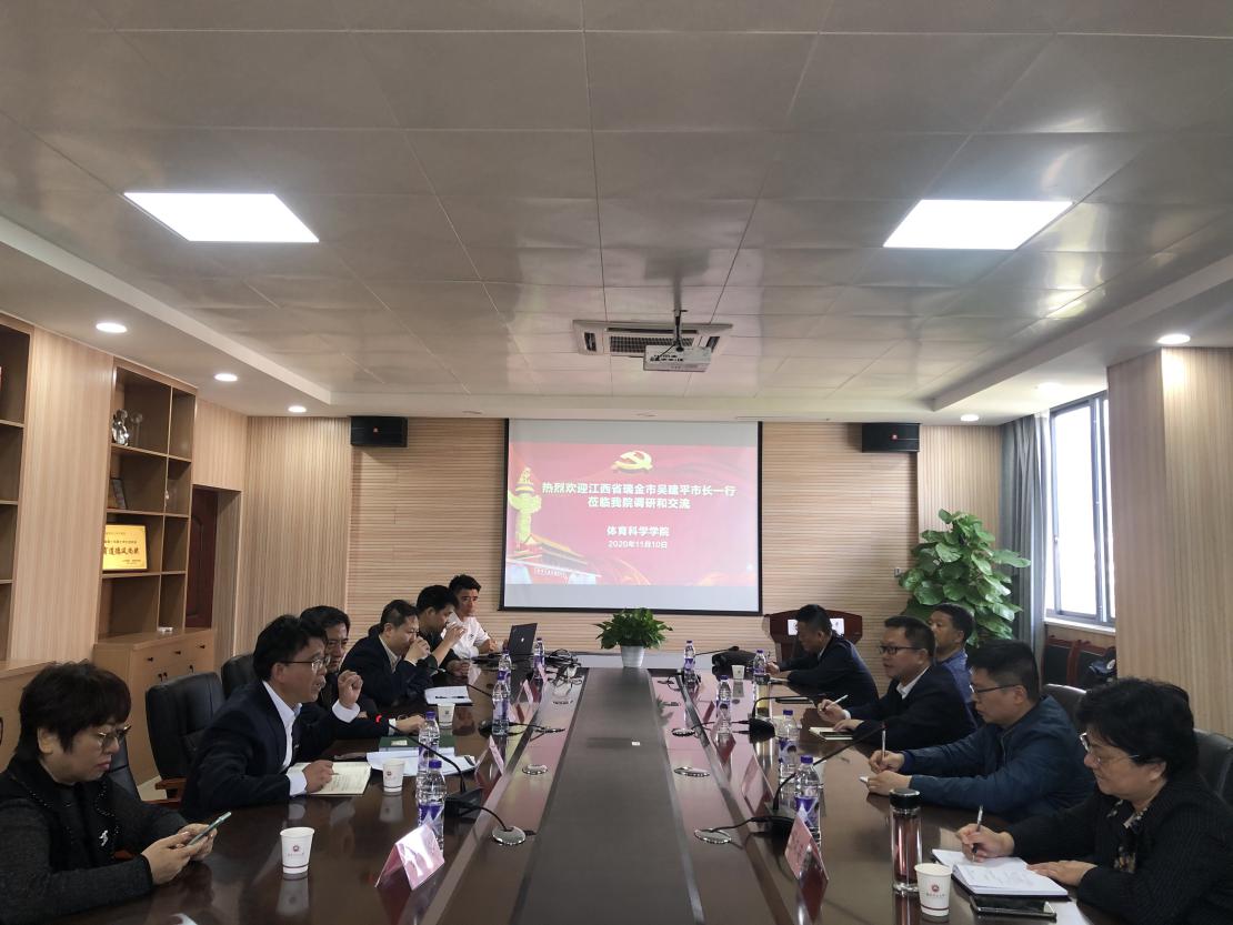 11月10日,江西省瑞金市市长吴建平、副市长汤晓斌、政协副主席陈家祥等一行6人来体育科学学院调研交流。院领导陈振祯、方千华、钟晓波,中意合作办学首席专家、教育部校园足球专家委员会科研工作组副组长蔡向阳,广州派迪因公司董事长钟文琴,及相关负责人参加了调研交流活动。