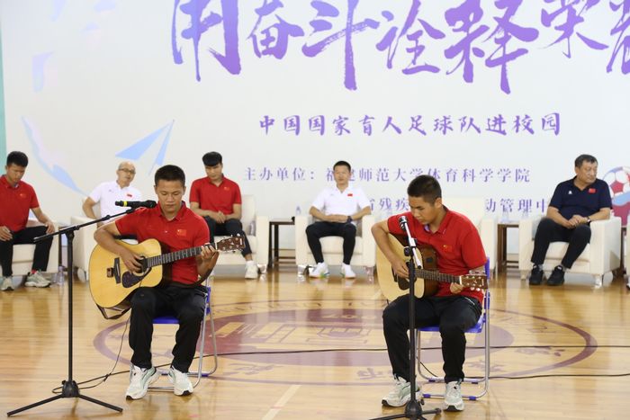 在分享环节,队员们通过朴实的语言,讲述了他们在盲人足球道路上跌宕起伏、迎难而上的心路历程,表达了对祖国、团队、亲友的感激以及为国争光的自豪。教练员王桂顺、李进,守门员许华楚还以校友的身份,分享在校学习经历。活动中,两位队员献唱歌曲《蓝莲花》,将现场气氛推向高潮。