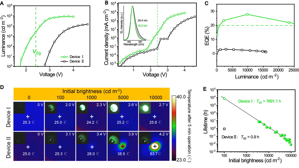 Recently, Zheng Song, a doctoral student in condensed matter physics at the College of Physics and Energy, made a significant breakthrough in the field of perovskite light-emitting diodes (PeLEDs). Guided by Associate Professor Wang Zhibin and Professor Chen Daqin, Zheng utilized the principle of "thermal-assisted upconversion luminescence" to suppress the intrinsic Joule heat of the device. This approach achieved ultra-high brightness and efficiency at low driving voltages. The green PeLED demonstrated a low turn-on voltage of just 1.7V, with peak brightness and an external quantum efficiency (EQE) reaching 90,295 cd/m² and 27.8%, respectively. This strategy not only enhances the device’s performance but also extends its operating lifespan, offering new insights into the development of efficient and stable PeLEDs.