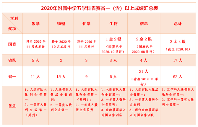 近日,附属中学在2020福建省中学生信息学、生物、物理、化学、数学竞赛中取得佳绩,累计获得一等奖62,获奖人数高居榜首,在省内学校中遥遥领先;入选省队人数总计17人,位居全省第一。