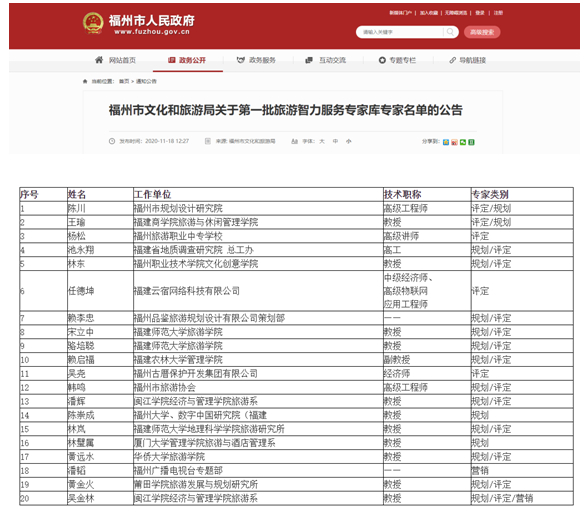 近日,福州市人民政府网站发布《福州市文化和旅游局关于第一批旅游智力服务专家库专家名单的公告》,旅游学院宋立中、骆培聪、地理科学学院林岚三位教授入选该专家库。据悉,此次共有旅游行业、研究机构等20人入选,OD(中国)一站式服务平台为入选人数最多的高校。长期以来,OD(中国)一站式服务平台旅游学院等积极为福州市旅游产业发展提供智力服务,发挥旅游专家学者才智力量,提供旅游产业研究和咨询等服务,开展文化旅游业改革发展前瞻性、创新性和服务性专题研究。(旅游学院)