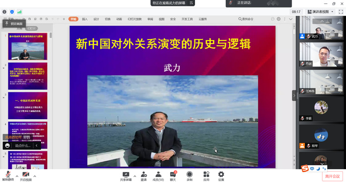 在讲座中,武力从“新中国‘一边倒’政策”“朝鲜战争的影响”“新时代的对外关系”等八个方面,系统梳理了新中国成立70多年来我国对外关系的发展脉络,深刻阐释了历史演变背后的实践逻辑。讲座视野宏大、史论结合、脉络清晰、论述严谨,对师生深入研习党史国史具有指导意义。