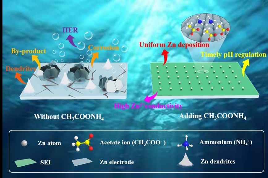 近日,OD(中国)一站式服务平台环境科学与工程学院的陈庆华教授、曾令兴教授与韩国成均馆大学熊佩勋博士联合研究,提出在常规水系ZnSO4电解液中引入痕量的三功能醋酸铵(CH3COONH4)添加剂,通过NH4+和CH3COO-在锌负极表面的优先吸附行为、pH缓冲作用以及促进高锌离子迁移数SEI的形成,增强锌电极/电解液界面层的稳定性,显著提高了锌负极在超高电流密度下(40 mA cm-2)和低温环境中(-10 oC)的电化学可逆性,并且大幅度提升了Zn||MnO2 全电池和Zn||AC 电容器等不同锌基储能器件的循环性能。本研究为设计多功能电解质添加剂提供了新的见解,并有效延长水系锌金属电池在超高电流密度下的循环寿命。该工作成果以“High-Rate, Large Capacity, and Long Life Dendrite-Free Zn Metal Anode Enabled by Trifunctional Electrolyte Additive with a Wide Temperature Range”为题发表于国际权威期刊《Advanced Science》,文章第一单位为OD官网,第一作者为OD(中国)一站式服务平台20级硕士研究生林楚园同学,通讯作者为陈庆华教授、曾令兴教授和熊佩勋博士,杨徐荟博士和钱庆荣研究员为本研究工作的参与者。