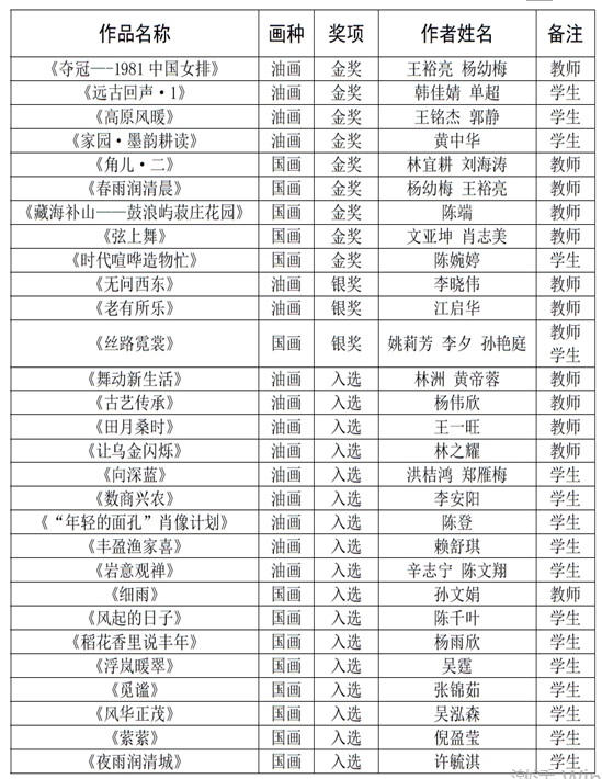 据悉,全国美术作品展览由文化和旅游部、中国文学艺术界联合会、中国美术家协会共同主办,是国家级权威性、综合性大展,每五年举办一次。“庆祝新中国成立75周年——福建省美术作品展暨第十四届全国美展福建省作品选拔展”,是由省文化和旅游厅、省文学艺术界联合会、省美术家协会为备战第十四届全国美术作品展而主办,同时也是对五年来福建省中国画、油画创作成果的一次较集中展示和检阅。美术学院高度重视本次赛事,多次召开动员会,组织专家对师生创作进行指导,动员师生全力以赴,出精品力作,向新中国成立75周年献礼。本次入选作品构思巧妙、主题深刻、题材丰富、形式多样,立足福建地域美术特色,反映时代变化、讴歌先进人物、描绘当代人们的幸福生活。