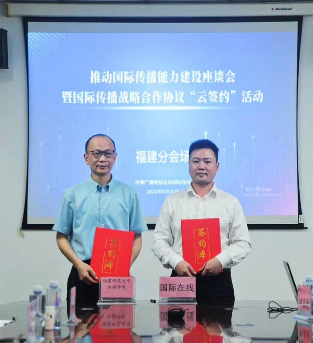 近日,中央广播电视总台推动国际传播能力建设座谈会暨国际传播战略合作协议“云签约”活动福建分会场在传播学院举行。传播学院院长谢宗贵,中央广播电视总台“国际在线”网站福建频道负责人郜积学,以及学院实践实验管理中心、中央广播电视总台国际在线福建频道相关人员参加了活动。