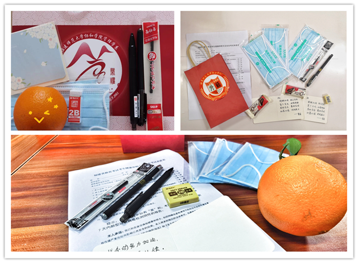 外语系也为考研学子准备了祝福包,有用于装相关证件和文具的笔袋、黑色签字笔(及备用笔芯)、橡皮擦、口罩、安全考试承诺书、以及寓意“得分”的德芙巧克力和辅导员们写的贺卡,传递关怀与祝福。